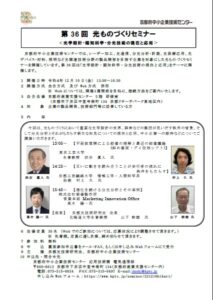 お知らせ一覧をみる>京都府中小企業技術センターでは、レーザー加工、光通信、分光分析・計測、光医療応用、光デバイス・材料、照明など光関連技術分野の製品開発を目指す企業を対象にした光ものづくりセミナーを開催しています。今回は「光学設計・認知科学・分光技術の現在と応用」をテーマに開催します。