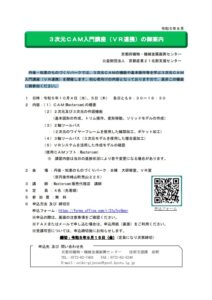 丹後・知恵のものづくりパークでは、3次元CAMの機能や基本操作等を学ぶ3次元CAM入門講座(VR連携)を開催します。初心者向けの内容となっておりますので、是非この機会に御参加ください。
