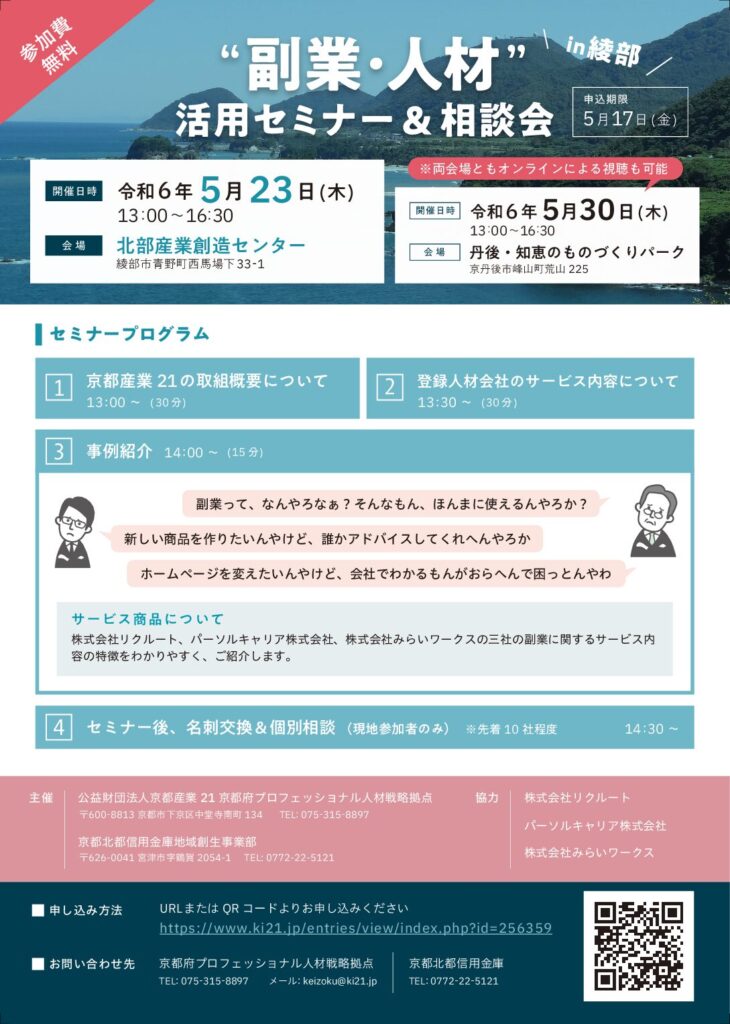 お知らせ一覧をみる>”副業・人材”活用セミナー&相談会 in 綾部・京丹後