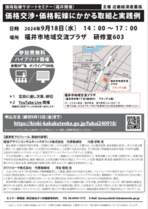 原材料やエネルギー費などが価格高騰し、深刻化する人手不足対策としての労務費も上昇する今日において、中小企業等が持続的成長を実現するためには、上昇するコストの適切な価格転嫁が喫緊の課題となっています。今年度、近畿経済産業局では、中小企業をはじめとするすべての事業者向けに、価格転嫁の機運醸成及び適切な価格転嫁の円滑化をめざすことを目的とする価格転嫁サポートセミナーを開催いたします。本セミナーでは、価格交渉・価格転嫁に関する国や県の施策説明や地域機関の取組、企業への価格交渉に関する支援を数多く経験した有識者による実践方法のわかりやすい解説に加え、価格交渉・価格転嫁における実践企業の取組事例を通じて、価格転嫁の機運醸成を推進していきます。ご関心のある方はぜひご参加ください。